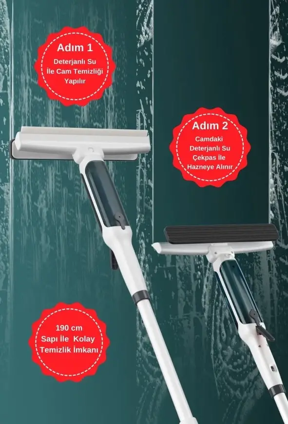 Spreyli, kirli ve temiz su hazneli cam temizleyici ile iz bırakmadan tüm camlarınızı kolaylıkla silebileceksiniz.