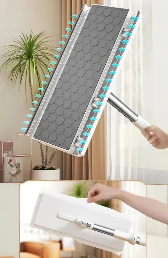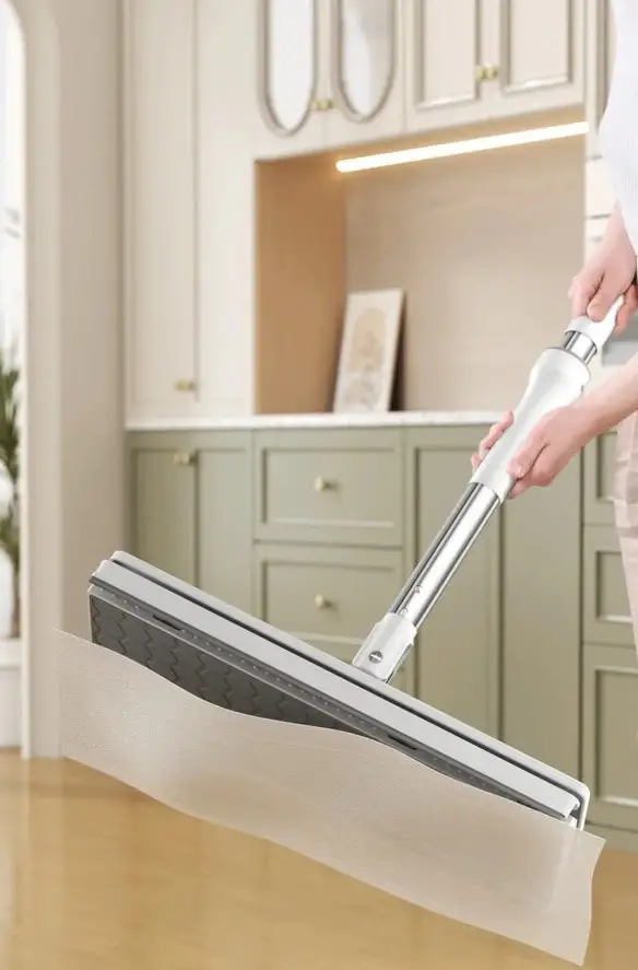 Mop başlığının altına bezinizi veya kullan at temizlik bezinizi yerleştirip sopaya baskı uygulayarak bezi palete sıkıştırın.